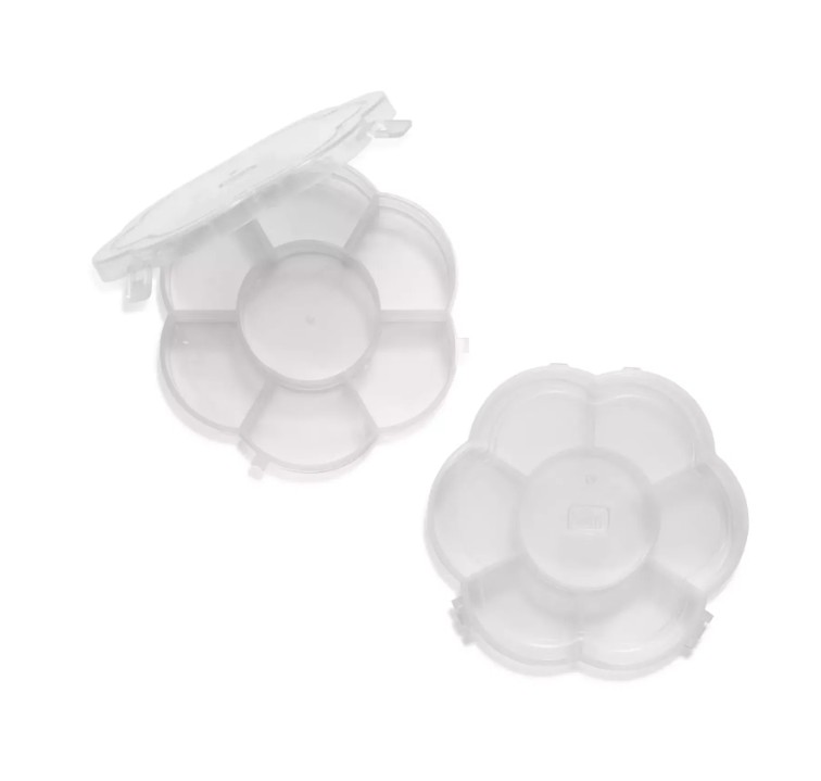Když šijete, rychle sbíráte nejrůznější drobnosti na svém šicím stole. Pokud je chcete mít rychle a snadno po ruce, tento sortiment ve tvaru květiny si zamilujete! Skvěle se hodí pro ukládání knoflíků, oček a dalších drobností a můžete v ní mít i svá smíšená balení druků Color Snaps nebo Jersey Color seřazená podle barev. Praktická uzavíratelná krabička se 7 přihrádkami je vyrobena z kvalitního plastu, nabízí flexibilní uložení věcí potřebných k šicímu projektu a je libovolně použitelná. Jeho design ve tvaru květiny, když je naplněn barevnými předměty, přináší závan jara do každé šicí místnosti. Jedno balení obsahuje dvě krabice na sortiment.