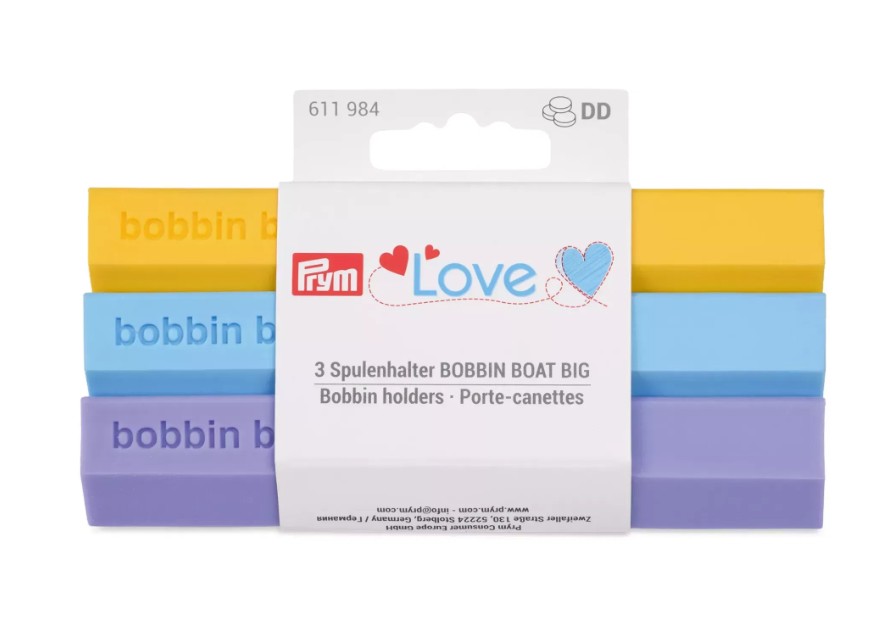 Prym nabízí ideální úložný prostor pro cívky "Jumbo Size" s průměrem 26 mm: Držáky na cívky BOBBIN BOAT BIG pojmou až 9 velkých cívek, ideální pro série BERNINA 4, 5 a 7. Sada od Prym obsahuje tři držáky na cívky v trendy barvách.