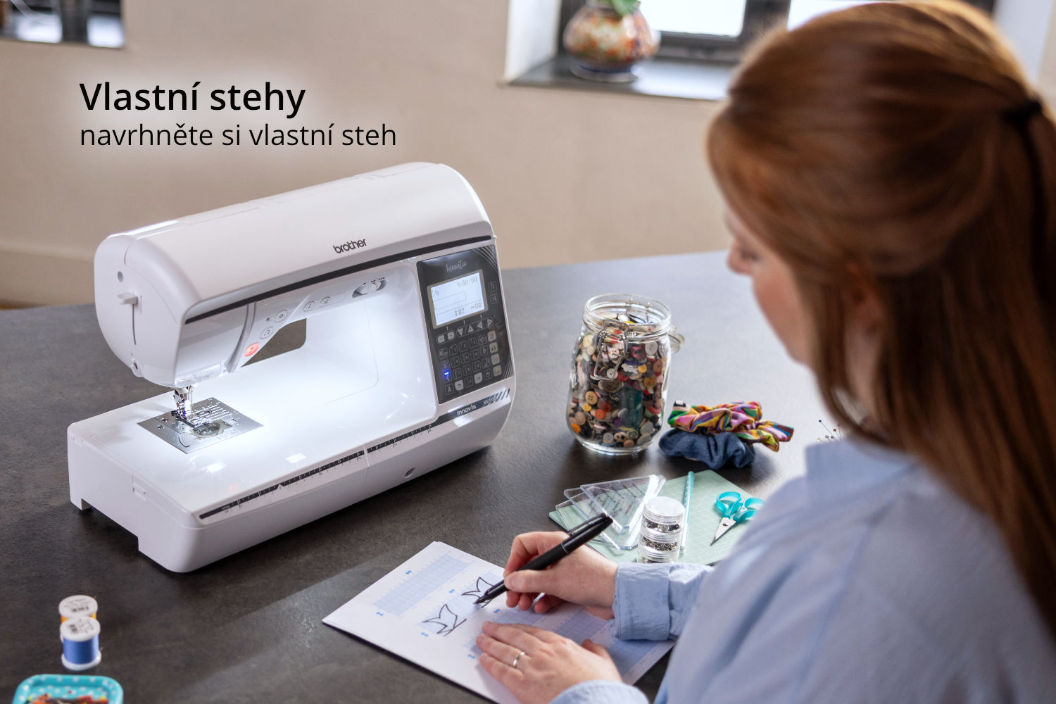Brother Inventio NV1350 má díky stranovému podávání ozdobné stehy až 40 mm široké a zvládnete s ním zakázkové šití i tvoření pro zábavu!