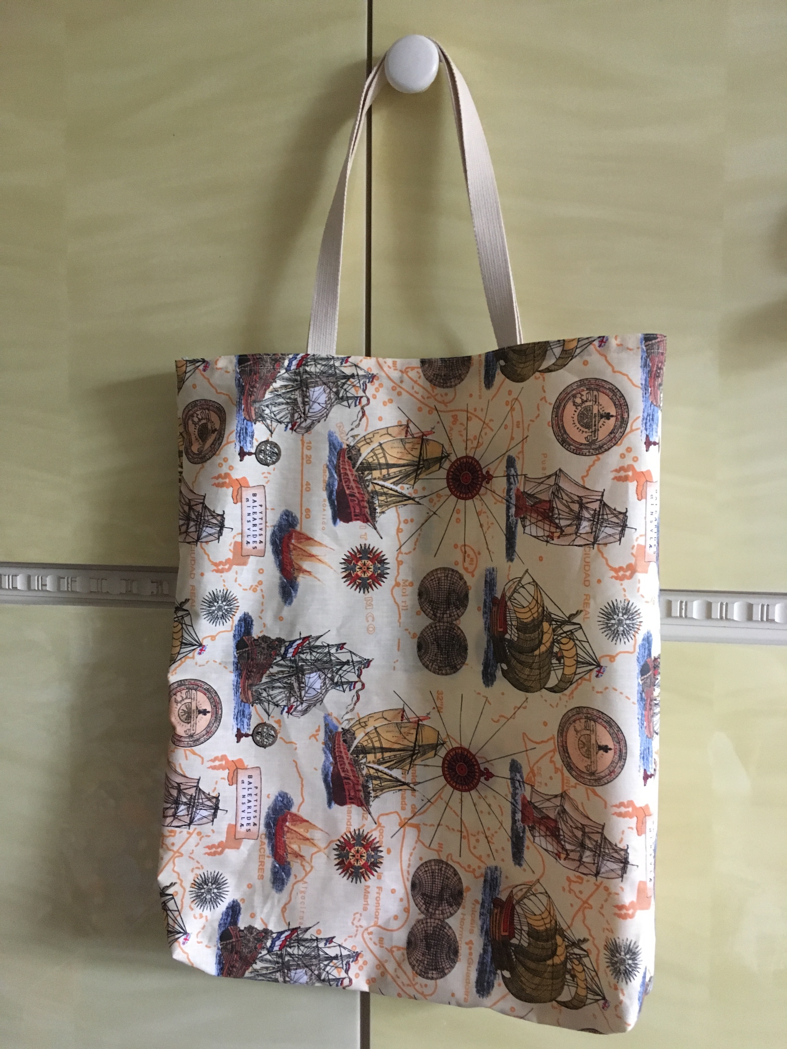 nákupní taška 100%bavlna, ruční výroba (začištěno na overlocku), rozměr cca 40x45cm/dno 5cm (odšité rohy), délka celého ucha je cca 49cm, na obrázku jsou lodě. Rozlučte se s igelitkami a začněte šetřit přírodu touto "eko-taškou".