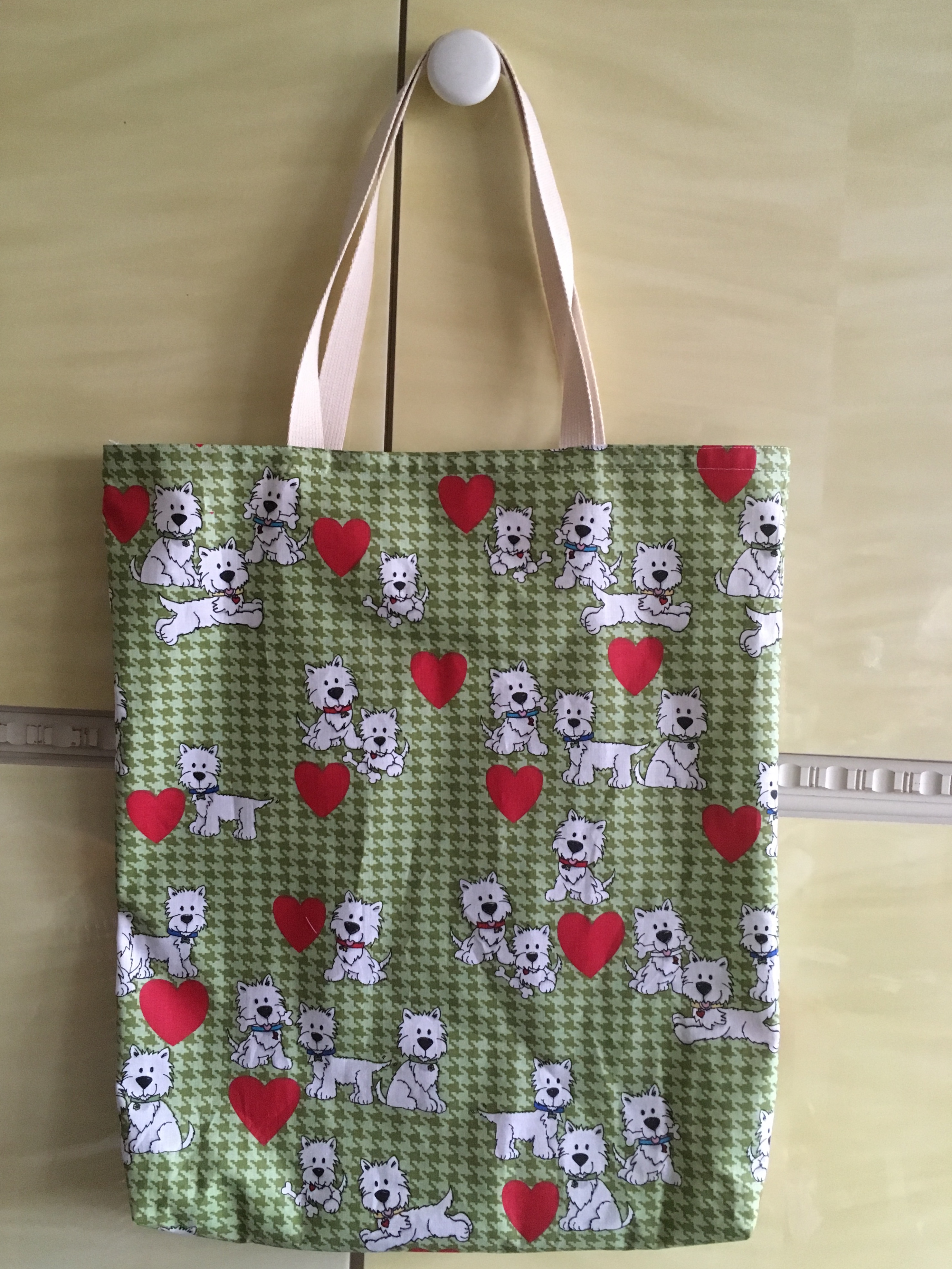 nákupní taška 100%bavlna, ruční výroba (začištěno na overlocku), rozměr cca 40x45cm/dno 6cm, délka celého ucha je cca 49cm, na obrázku jsou psi na zeleném podkladu. Rozlučte se s igelitkami a začněte šetřit přírodu touto "eko-taškou".