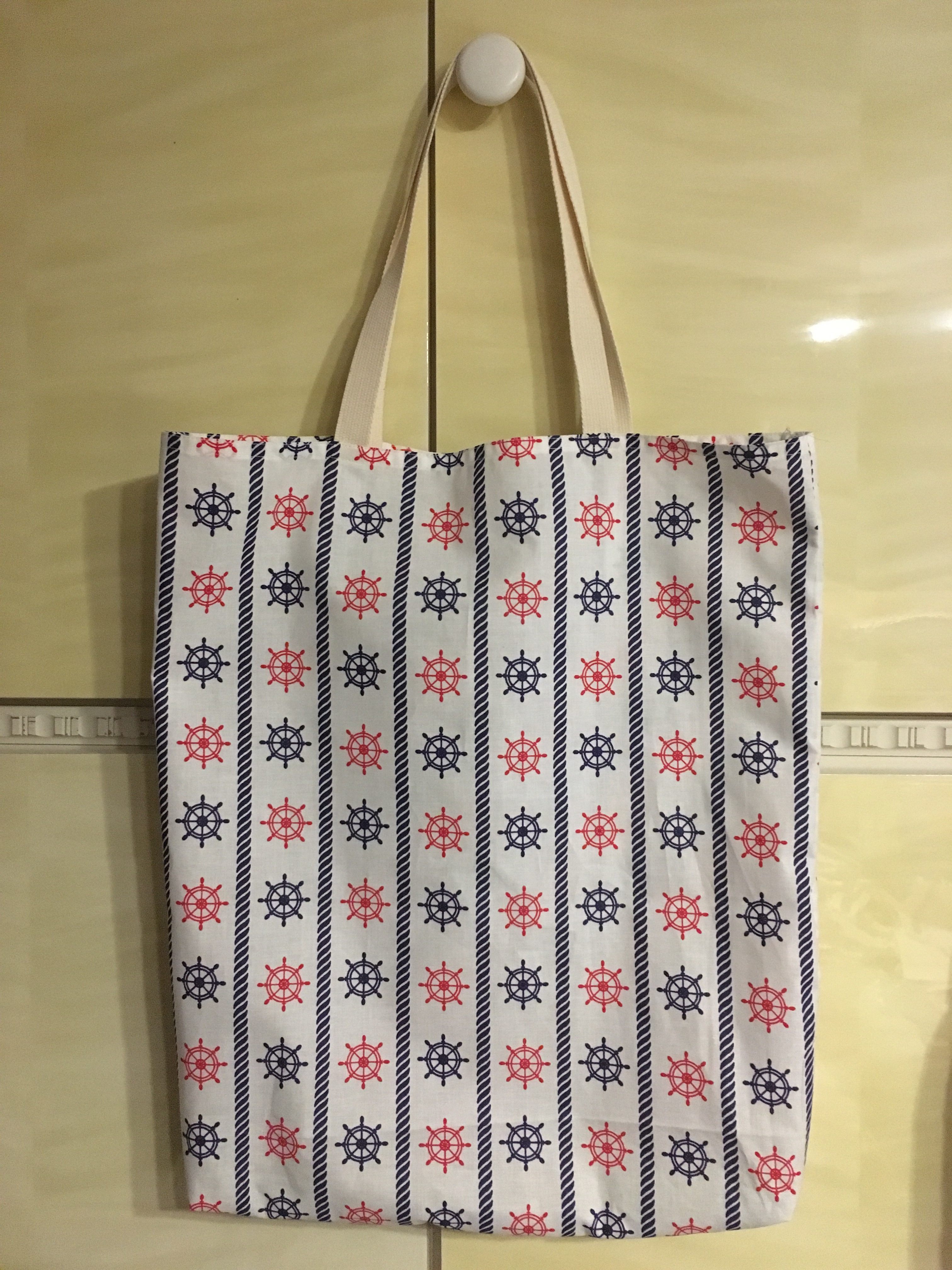 nákupní taška 100%bavlna, ruční výroba (začištěno na overlocku), rozměr cca 40x45cm/dno 6cm, délka celého ucha je cca 49cm, na obrázku jsou kormidla. Rozlučte se s igelitkami a začněte šetřit přírodu touto "eko-taškou".