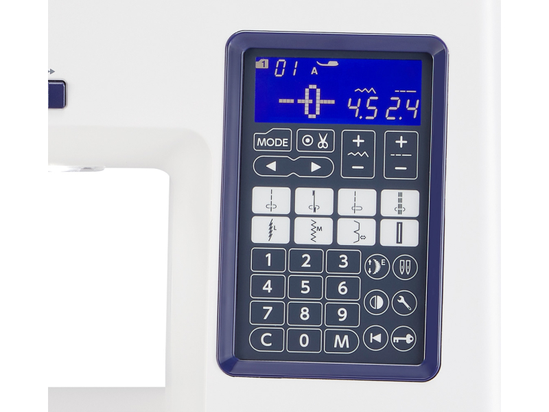 Intuitivní LCD displej, který vás informuje o aktuálním nastaveném stehu - stroj vám ukáže šířku stehu, délku stehu, ukáže vám zvolené číslo programu a ještě vám doporučí typ patky. Jednoduchým stiskem tlačítka můžete tyto parametry měnit. V případě, že nastavíte například šířku stehu, která pro daný steh již není povolena, dojde k upozornění a stroj si sám pohlídá maximální hodnotu. Možnost nastavení odstřihu nitě po dokončení šití - používá se u průmyslových strojů.