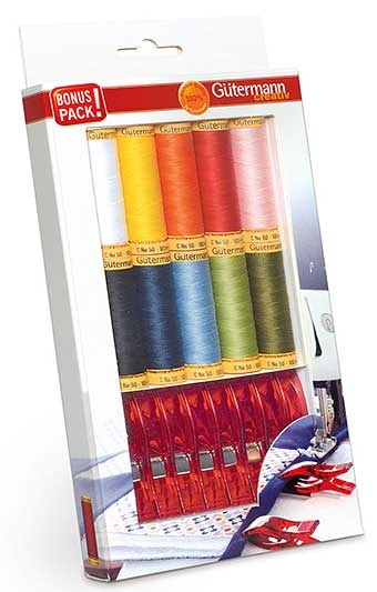 dárkový set nitě Gütermann 10x100m 100%bavlna + 8ks klipů na látky