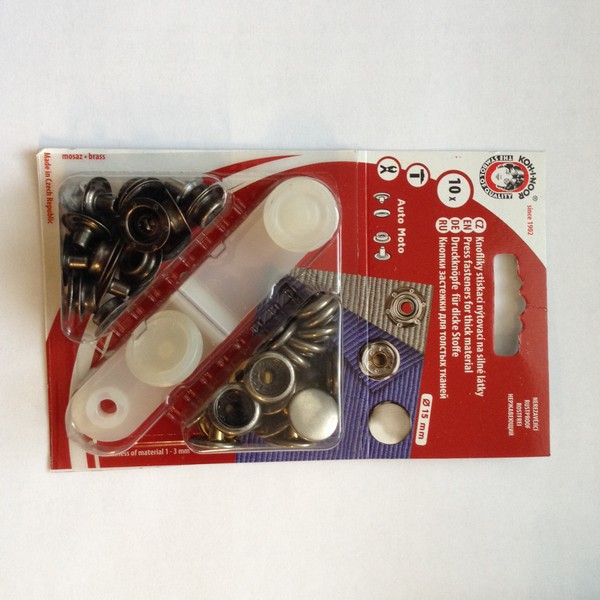 Knoflíky (druky) jsou určeny pro spojování silných a pevných druhů látek, jako např. textilie, usně nebo plachtovina. Jsou vyrobeny ze zaručeně nerezavějící mosazi, povrchová úprava nikl. Průměr je 15 mm. Pro montáž jsou přiložena nýtovadla. Balení 10 ks/karta.