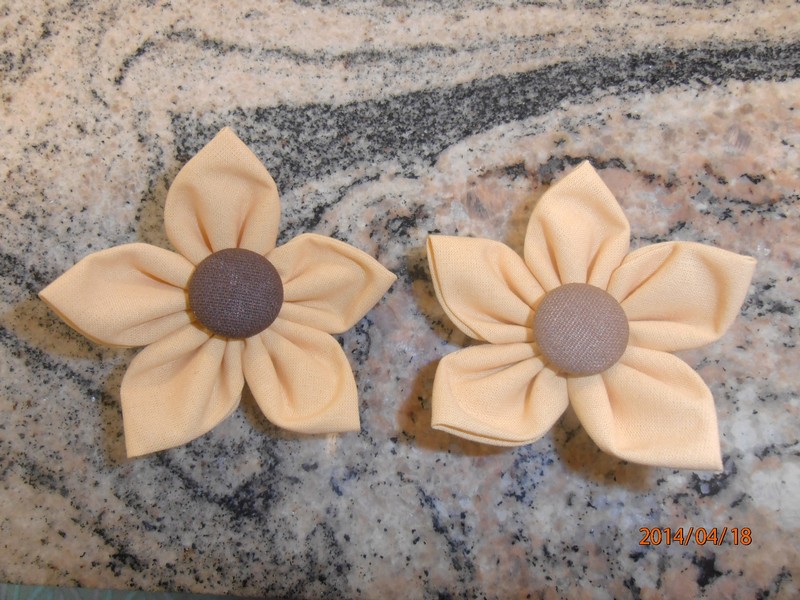 kanzashi květina 8cm meruňková se sv.hnědým středem         možnost použít jako brož nebo do vlasů.                     Ruční práce z látky
