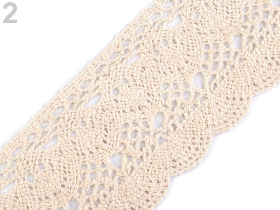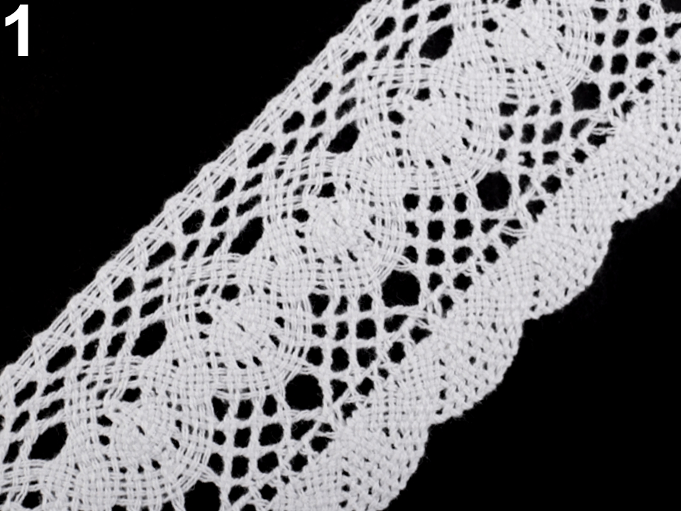 Široká paličkovaná krajka vaše výrobky ozdobí do vintage stylu. Jednu stranu má rovnou, druhou zdobí obloučky.