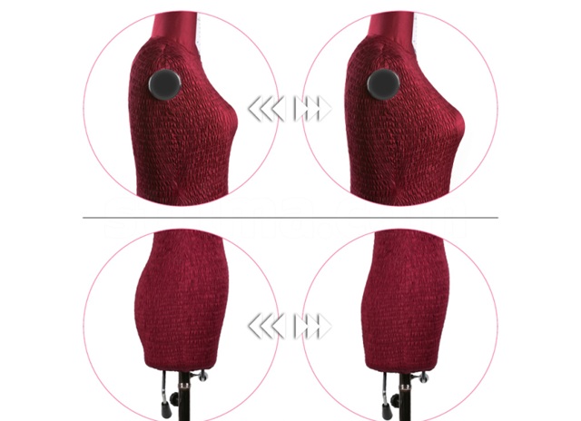 Horní kovový knoflík slouží pro docílení různých velikostí, které se zobrazí na krku figuríny. Otáčením směrem hodinových ručiček se nastaví na nejmenší velikost, otáčením proti směru hodinových ručiček se nastaví na velikost největší. Páčky v dolní části figuríny (ženy) slouží případně pro zvýšení nebo snížení hrudi (prsou) a zvětšení nebo zmenšení hrudi (prsou). Potah figurín je elastický ze 100% bavlny.
