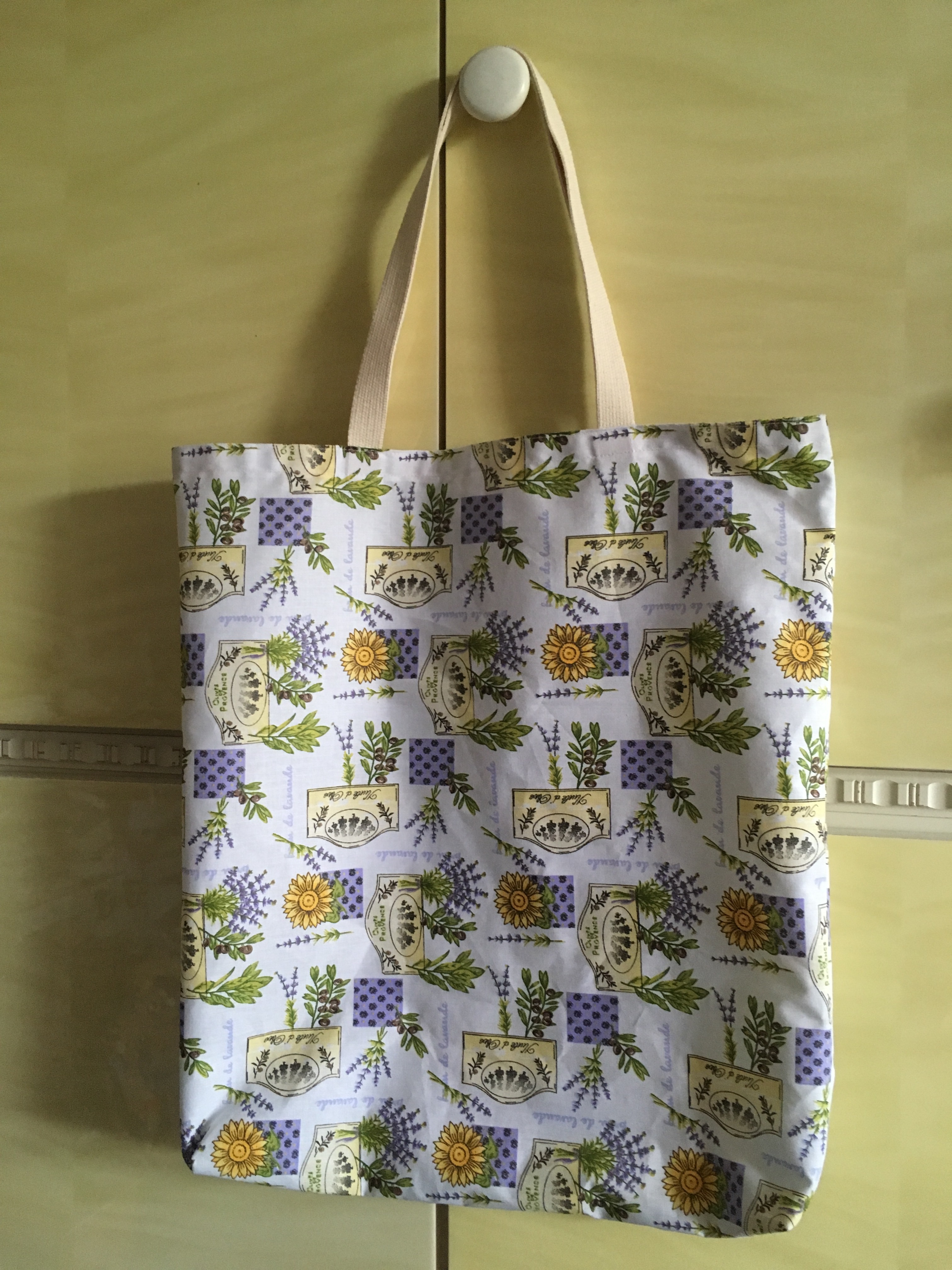 nákupní taška 100%bavlna, ruční výroba (začištěno na overlocku), rozměr cca 40x45cm/dno 5cm (odšité rohy), délka celého ucha je cca 49cm, na obrázku jsou slunečnice, olivy a levandule. Rozlučte se s igelitkami a začněte šetřit přírodu touto "eko-taškou".