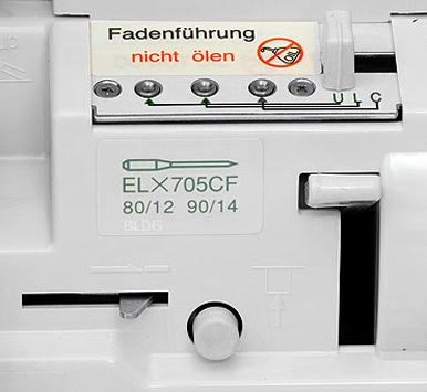 „Electronic Extraordin Air Threading“ (elektronické navlékání vzduchovou tryskou) pro rychlé a snadné navlečení horního i dolního smyčkovače pomocí tlačítka až do očka smyčkovače.