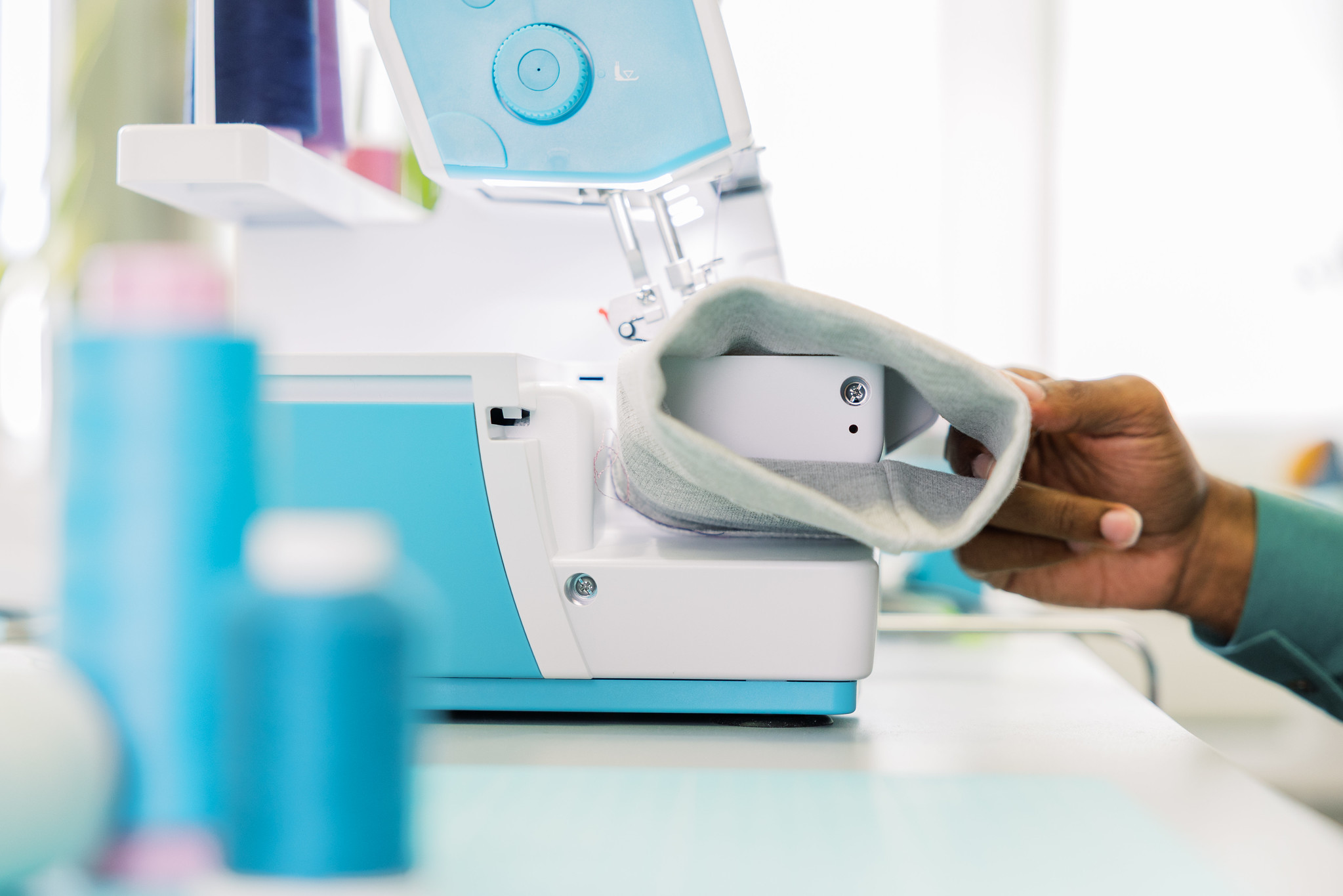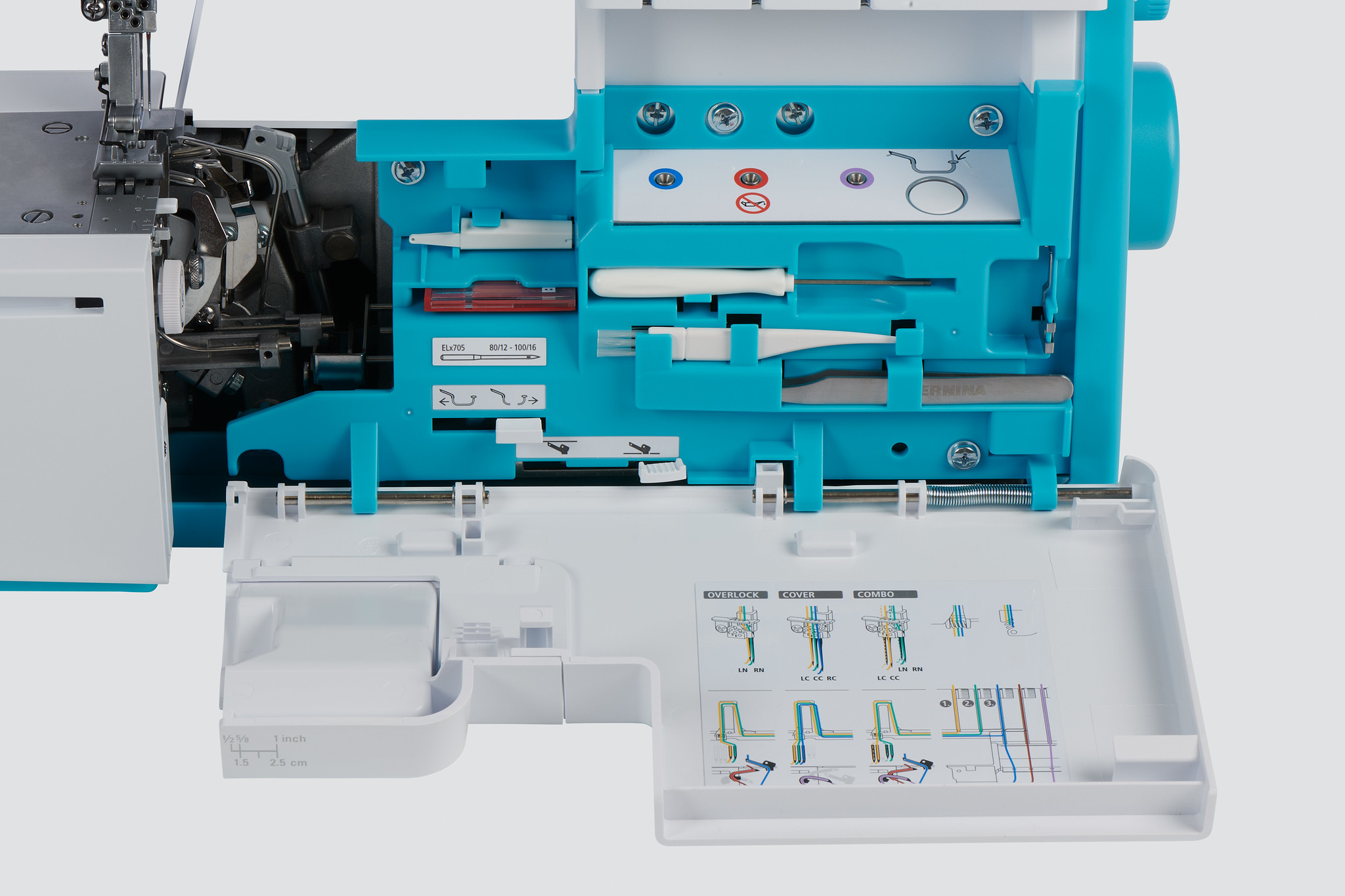 Velká pracovní plocha. Mnoho prostoru vpravo od jehly (130 mm) dává tomuto overlocku další rozměr. Velká pracovní plocha je ideální pro vedení a držení těžkých šicích projektů za jehlou a poskytuje prostor pro všechny úkony v oblasti jehly a chapače: výměna přítlačné patky, připojení konvertoru horního chapače a mnohem více.
