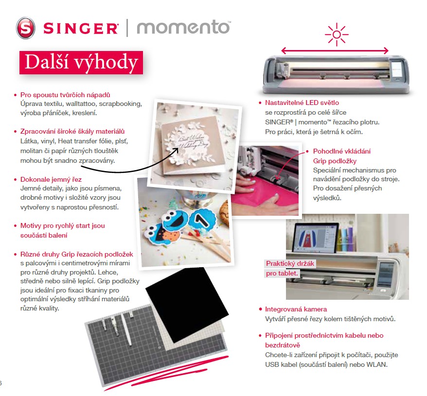 Řezací plotr SINGER MOMENTO přináší skutečnou revoluci do světa kreativního šití, quiltování i domácího designu. Tento mimořádně výkonný řemeslný stroj je ideální pro nadšence do práce s látkami, vinylovými fóliemi nebo jinými dekoračními materiály. Díky intuitivnímu ovládání, bohatému příslušenství a propojení s online knihovnou projektů zvládnete tvořit i bez hlubších technických znalostí. Ať už jste zkušený quilter nebo teprve začínáte, plotr vás spolehlivě provede každým krokem s přesností a jistotou. Vše je navrženo tak, abyste se mohli soustředit na samotnou kreativitu, a neřešit detaily ohledně nastavení. Tento plotr je skvělým parťákem pro každého, kdo touží tvořit svobodně, rychle a s profesionálním výsledkem.