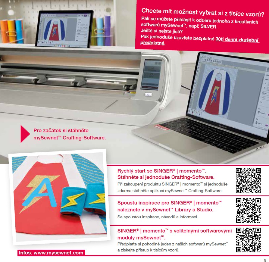 Řezací plotr SINGER MOMENTO doplňuje úžasně kreativní platforma. Prostřednictvím aplikace mySewnet získáte přístup k rozsáhlé online knihovně plné motivů, písem, quiltovacích vzorů a hotových projektů, které můžete upravit podle svých představ. Vše je snadno dostupné přímo z displeje nebo vašeho zařízení, bez zbytečného stahování a složitého nastavování. Ať tvoříte pro radost, podnikání nebo pro rodinu, plotr vám umožní přetvořit každý nápad v realitu a do detailu tak, jak jste si ho vysnili. Díky přiloženému příslušenství můžete začít tvořit hned po vybalení z krabice. V sadě najdete mimo jiné standardní i rotační čepel, 2 velikosti vinylových fólií, přenosový arch i adaptér pro pero. Vše je zkrátka připraveno k okamžitému použití.