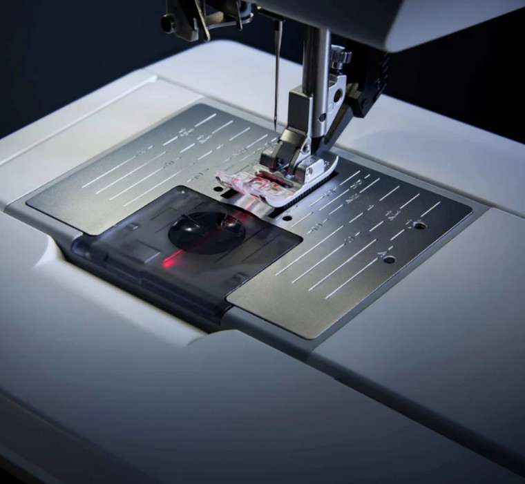 Promítejte laserovou vodicí linku přímo na látku pro snadné zarovnání stehů. Posouvejte laserovou linku doleva nebo doprava pro snadné zarovnání linií dekorativních stehů, konzistentní rozestupy quiltingových linií a další.