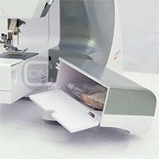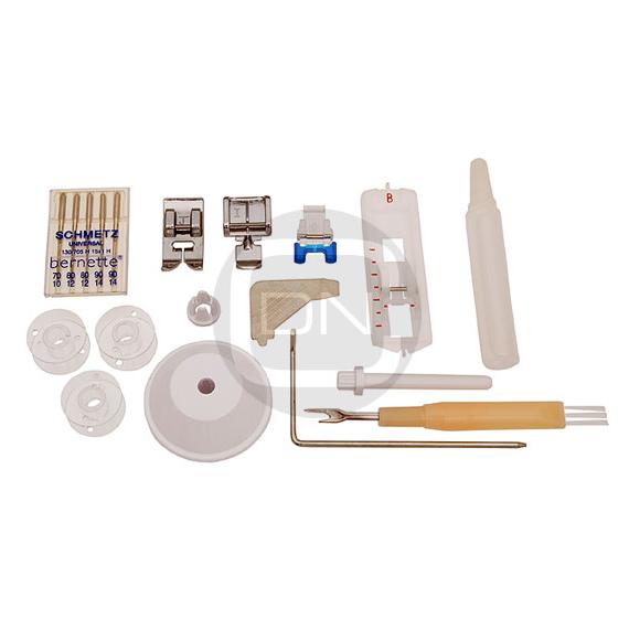 • Bohaté příslušenství obsahuje : kryt stroje, patka pro přišívání zipů, patka pro přišívání knoflíků, patka pro šití knoflíkových dírek, sada jehel, šroubováček, páráček, štěteček, cívky(3), vodič okrajů, cívkový knoflík, držák cívky.
