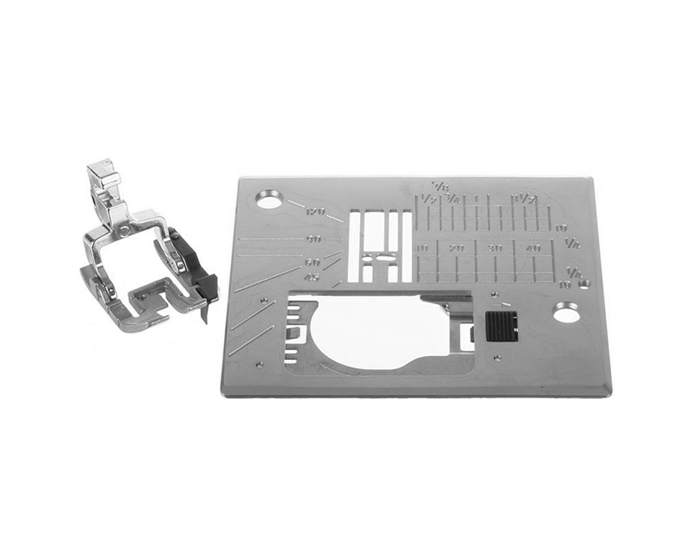 Speciální stehová deska pro rovné šití, při šití šikmo přes střiženou látku krásně stroj drží stopu a neuhýbá i přes švy (pro težší materiály, speciální materiály) dále stehová deska má otvor pro jehlu menší, takže nedochází k úhybu jehly a materiál perfektně provazuje a konce trojúhelníků se vám nenacpou do spodní díry. Součástí je patka s vodičem a jehelní deskou, 1/4, díky které i když používáte horní přídavné podávání perfektně vidíte šitý materiál. Je určena pro stroj Janome Memory Craft 6600P a Janome 7700 . Velmi populární pro patchwork.